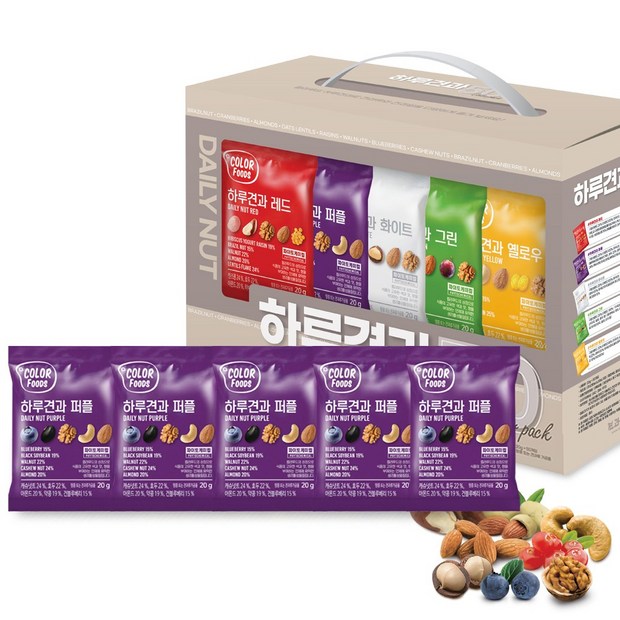 • [웰빙 견과공장] 프리미엄 데일리 견과 혼합세트: 매일 건강을 챙길 수 있도록 1회 섭취량으로 소분 포장된 제품입니다. 아몬드, 캐슈넛, 호두, 크랜베리 등 6가지 이상의 견과류와 건과일이 균형 있게 배합되어 있어 다양한 맛과 영양을 한 번에 즐길 수 있어요. 바쁜 아침 식사 대용이나 오후 간식으로 안성맞춤이며, 개별 포장이라 위생적이고 휴대성이 뛰어납니다. 건강한 라이프스타일을 추구하는 분들께 강력 추천해요.