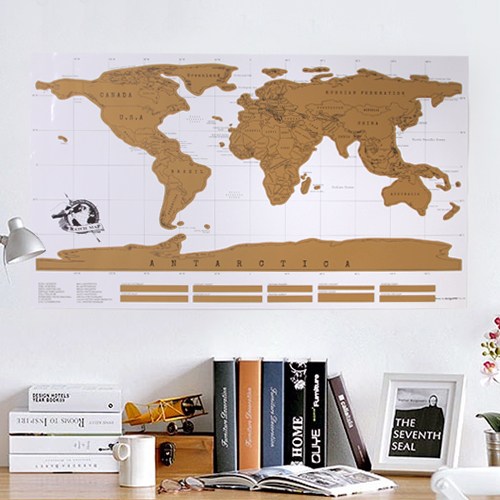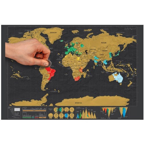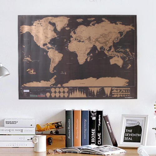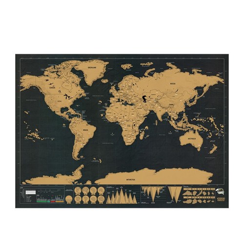 이 제품은 사용자가 방문한 국가나 도시를 동전이나 전용 스크래퍼로 긁어내면, 아래에 숨겨진 다채로운 색상이 드러나는 방식입니다. 검은색이나 금색 등 어두운 표면 아래 화려한 색상 대비가 특징이죠. 🤩